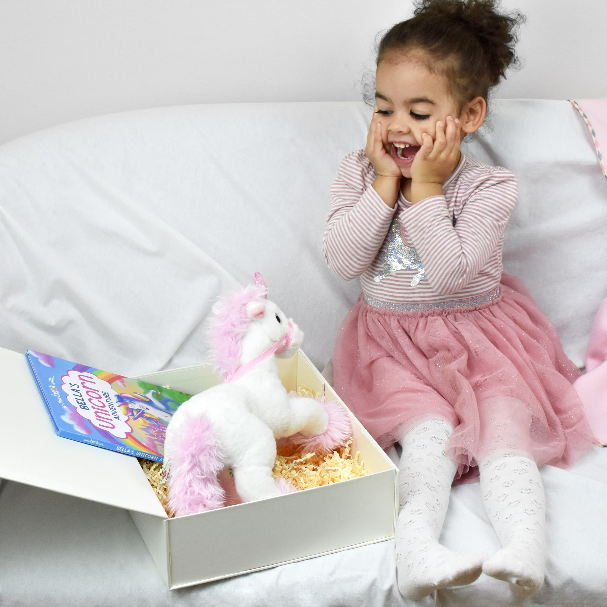 A magical combination of unicorn plush toy and personalised story-book presented in a beautiful box that will go down a treat with the lucky recipient. This is a gift perfect for young children who love unicorns. The story-book features a unicorn with the child's name which will appear throughout the text and within the illustrations. Their name will also appear alongside a personal message on the opening page. The plush toy is a soft and lovable unicorn, a dazzling new friend for sharing the unicorn adventure story with. The book and plush toy are presented inside a premium gift box with a fabulous 'Just for You' embossed design. The box itself is tied together with a silk ribbon, adding to the premium nature of the gift, ideal to give on any occasion. Colour of the unicorn plush may vary.