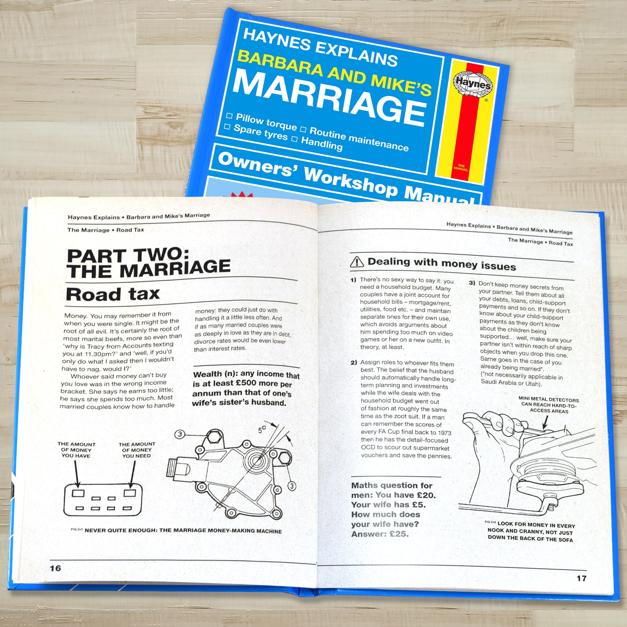 From routine maintenance, pillow torque, spare tyres, and handling, this owner's workshop manual will keep your marriage in tip top condition. The perfect wedding, engagement or anniversary gift, this manual is personalized throughout with both names of the couple at the top of each page and can include a message from you (cheeky or otherwise) on the opening page. The book even includes pre-wedding advice such as stag/hen night dos and don'ts, such as 'don't go too far. Shave nothing that won't grow back, apply no tattoos that can't be easily removed, inflict no scars that won't fade.' Follow these tips and you'll be a bickering couple well into your dotage.