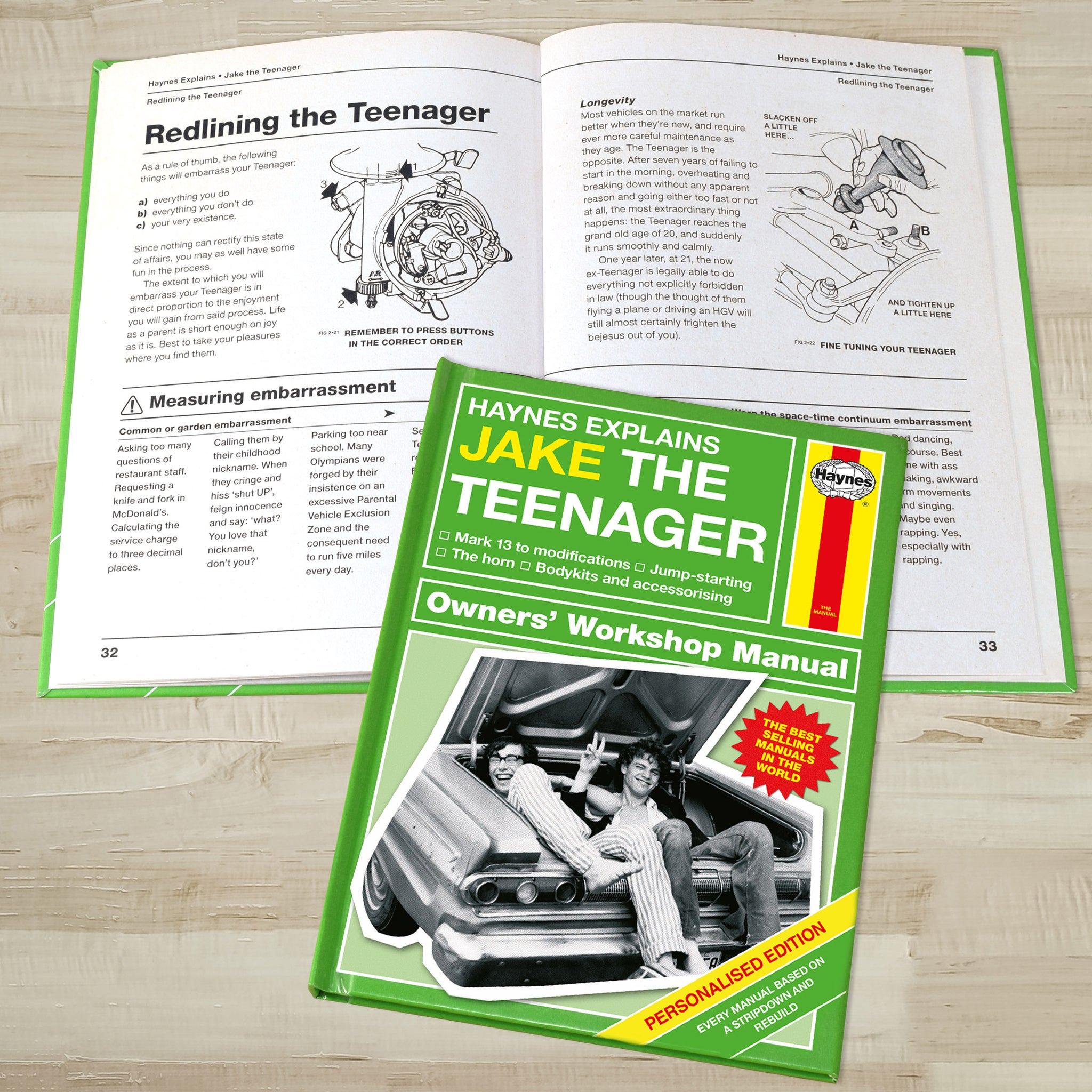 From body-kits and accessorising, modifications, jump-starting, and the horn, this owner's workshop manual will keep your parenting skills in tip top condition. The perfect gift for teenagers, or the parents of teenagers, this manual is personalized throughout with the terrible teen's name at the top of each page and can include a message from you (cheeky or otherwise) on the opening page. Full of supportive advice this book includes gems of wisdom such as 'to punish your teenager take them on holiday to a remote rural cottage where there is no mobile reception or broadband' and also 'the average 17-year-old today drinks twice as much as they did ten years ago. Though in fairness they were only 7 ten years ago.' Good luck!