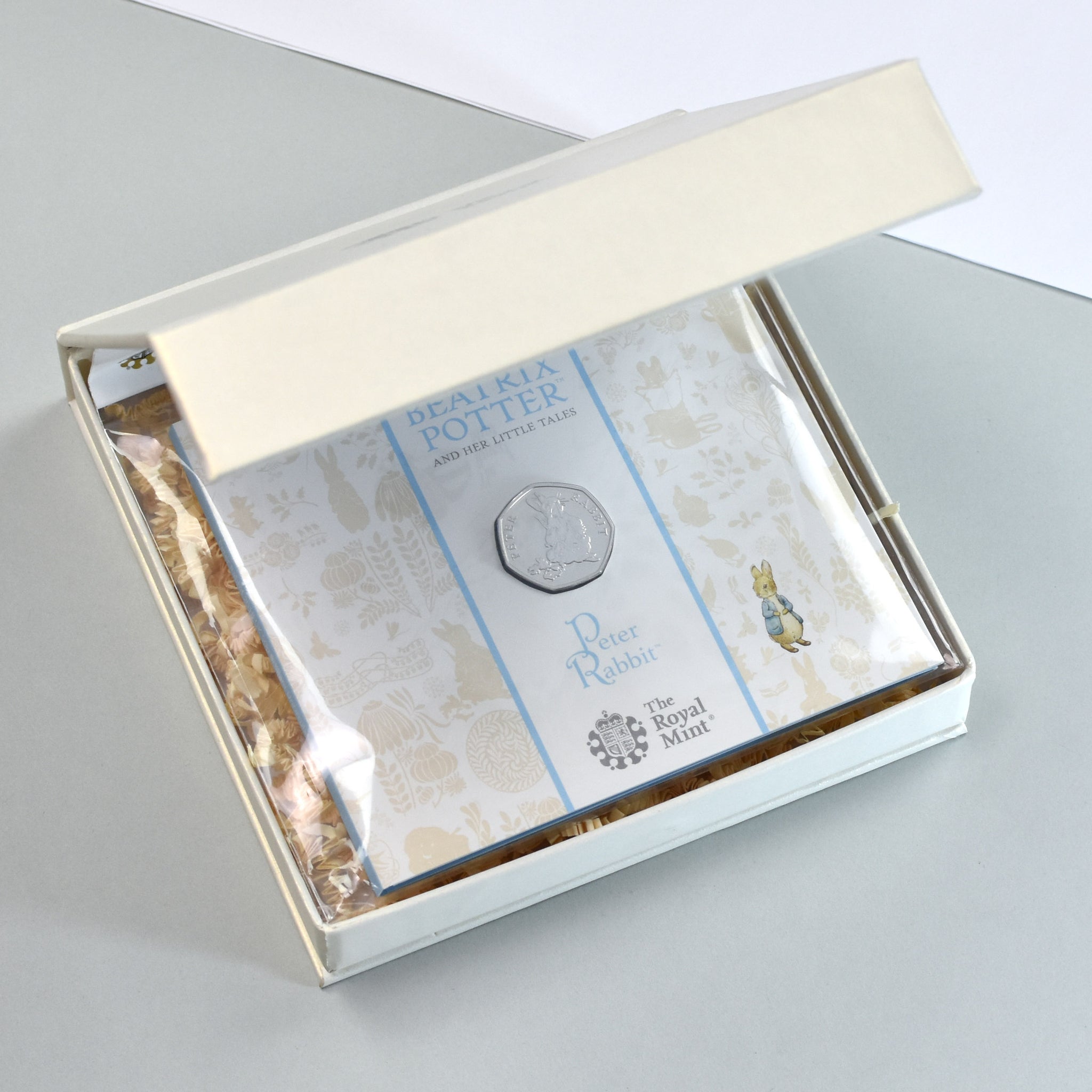 Inside this personalised gift box lies a special Royal Mint 50 pence coin that has been made specially to celebrate Beatrix Potter and her little tales. The Brilliant Uncirculated coin features Peter Rabbit and is one of only thousands to have been made by the Royal Mint. The box itself is personalised, with the recipient's name embossed on the lid and also printed on the inside of the lid above a personal message. A wonderful collectable item that can be given on any occasion.